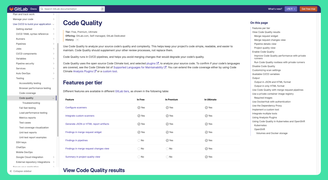Integrated development experience – Provides a fully integrated experience within the GitLab platform, offering quality reports directly in merge requests to catch issues before they're merged into the main branch.