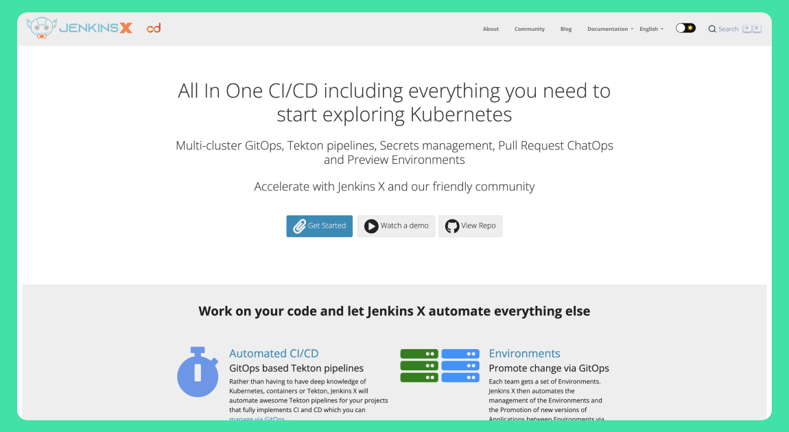 Environment promotion via GitOps – Unique to Jenkins X is its approach to promoting environments through GitOps, where changes to environments are managed through pull requests, integrating code quality checks and deployments into a seamless workflow.