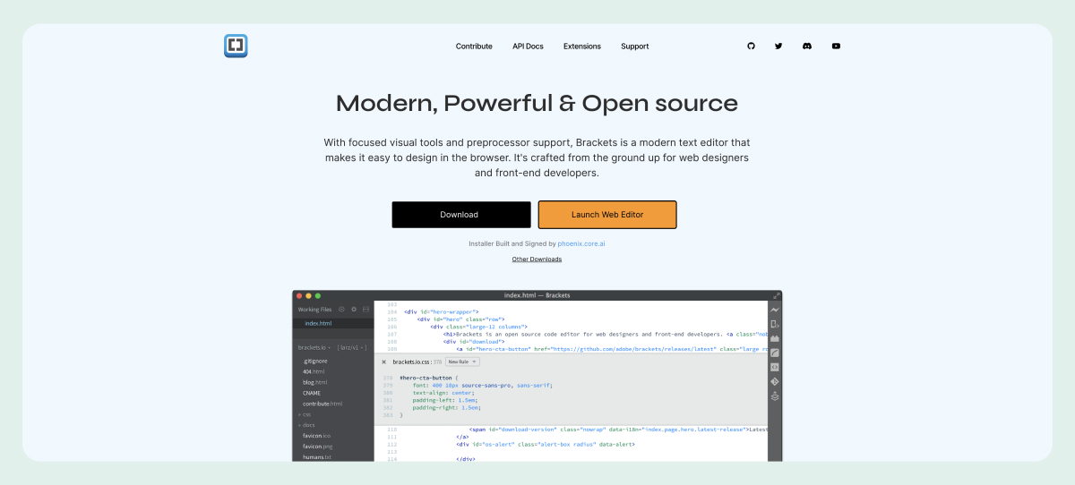 Brackets is an open-source code editor from Adobe with a clean interface designed to streamline front-end development workflows.