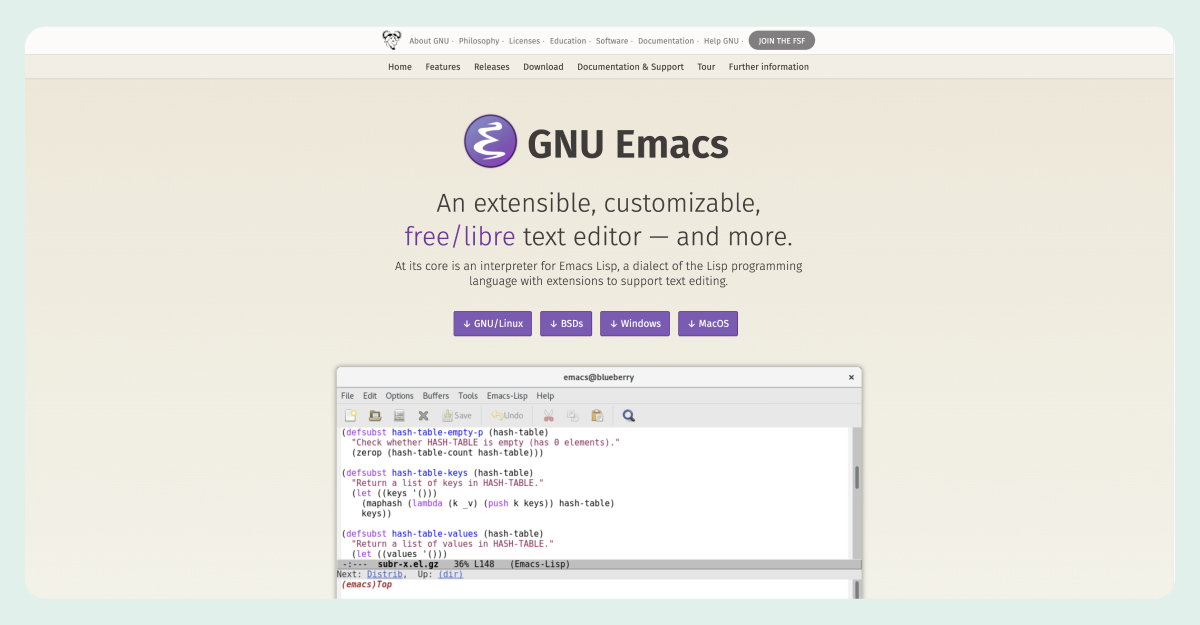 Similar to Vim, Emacs is another text editor with a long history and a devoted following. It boasts extensive extensibility and customization options, allowing you to tailor it to your specific workflows.