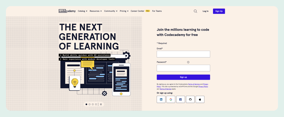 Codecademy offers interactive courses on various programming languages, including Python, JavaScript, and C++. With real-time coding exercises, it provides an excellent hands-on learning experience for beginners. Some material is locked behind a subscription, but if you like the free courses, you can subscribe to access the more valuable skills and career paths.