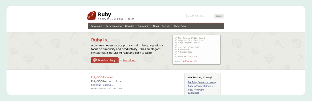 Ruby is known for its simplicity and productivity, making it a favorite for web development and rapid prototyping. Its elegant syntax is designed to be easy to read and write, allowing developers to quickly build and iterate on projects. Ruby is highly flexible and supports multiple programming paradigms, including procedural, object-oriented, and functional programming. Common use cases include:
