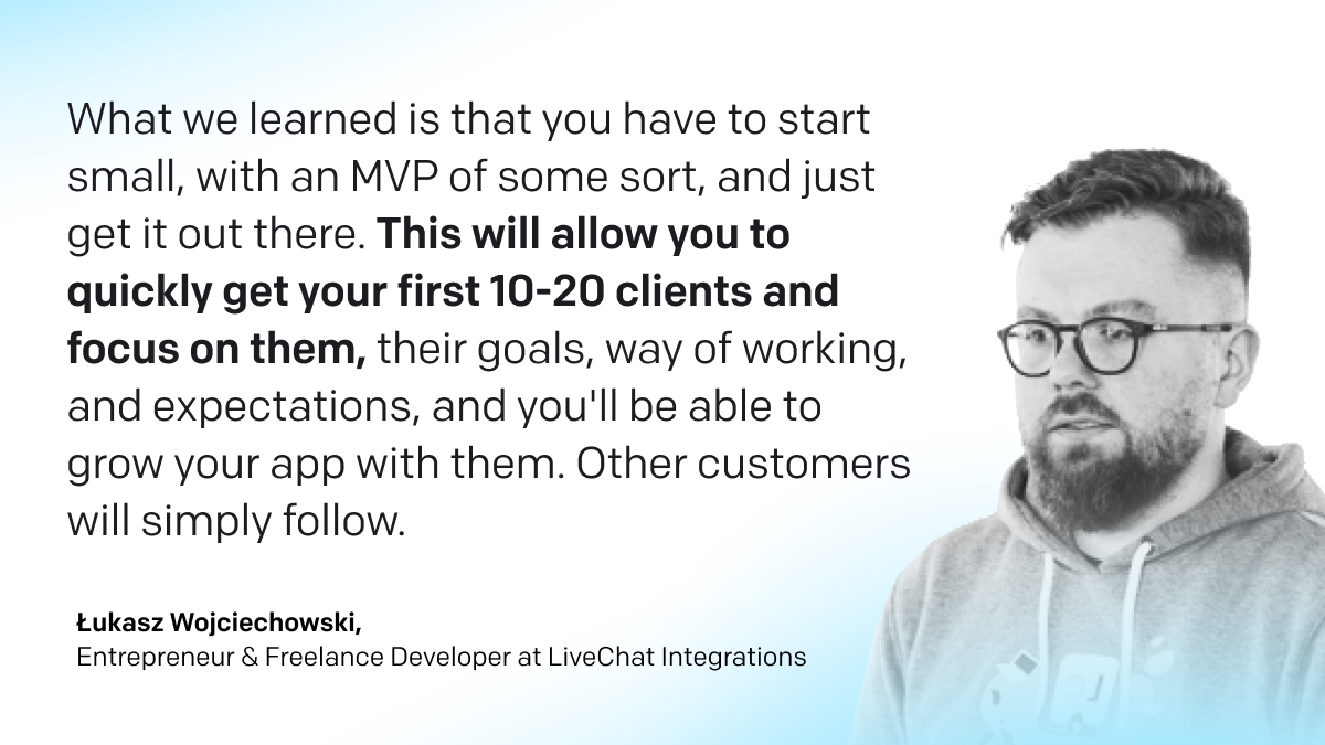 What we learned is that you have to start small, with an MVP of some sort, and just get it out there. This will allow you to quickly get your first 10-20 clients and focus on them, their goals, way of working, and expectations, and you’ll be able to grow your app with them. Other customers will simply follow.